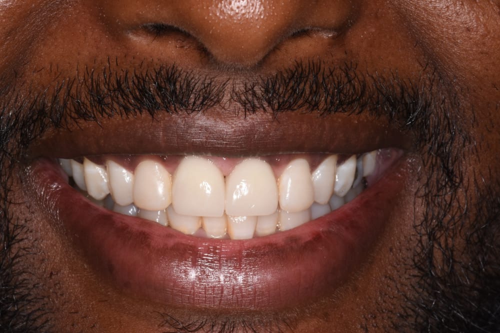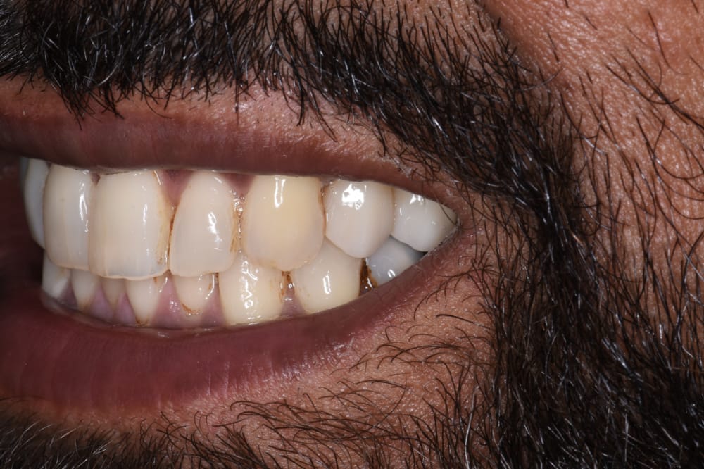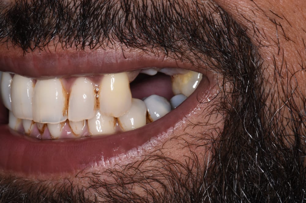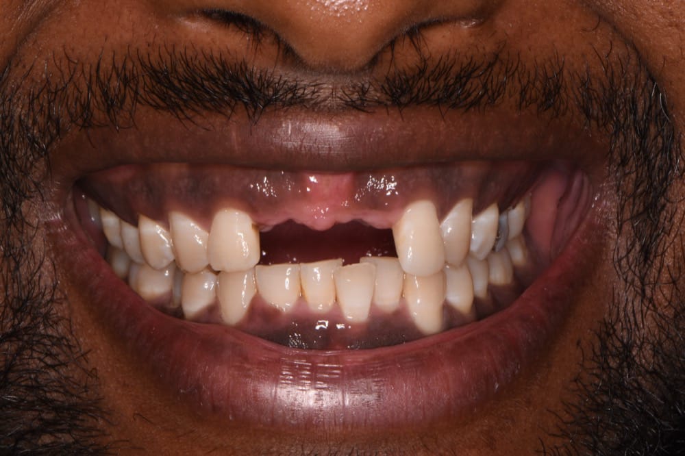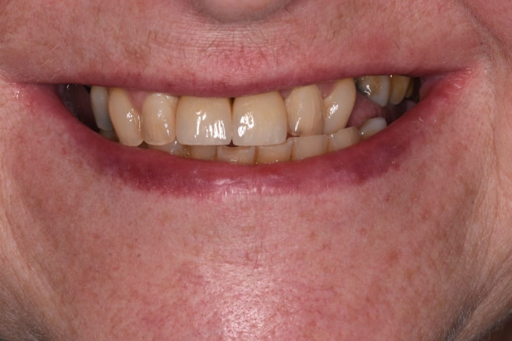 This patient suffered loss of teeth through periodontal disease. The teeth lost attachment to their surrounding tissues and became mobile and drifted forward. Mr Farooq removed the upper central incisors and replaced them with individual dental implants and implant crowns.